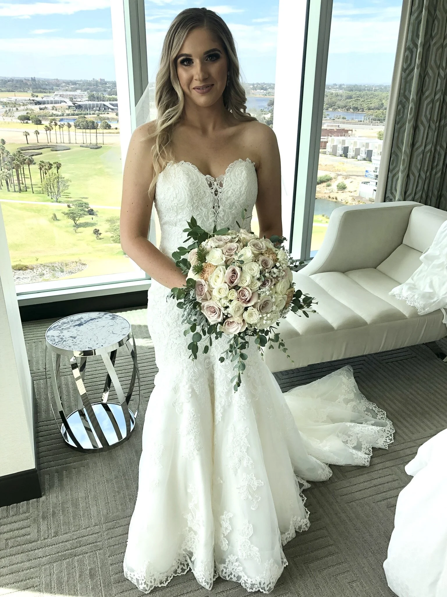 This classic gown features ivory beaded lace with a strapless sweetheart neckline, trumpet skirt and elegant train.